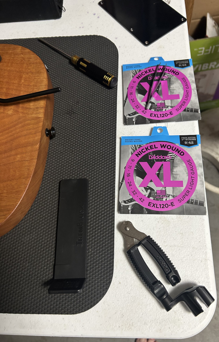 Fresh set of D'Addario XL 9-42 strings. Oh and a set of Gotoh headstock tuners as well. (See earlier posts on them).